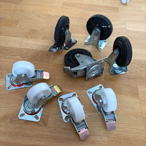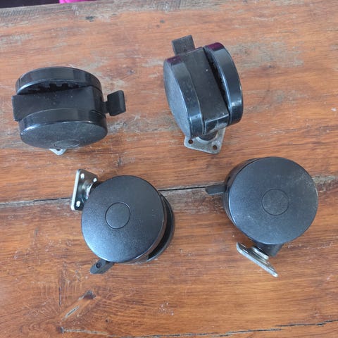 IKEA Möbelhjul och Möbelfötter i svart och träfärg. Möbelhjulen är svarta med metallfäste och möbelfötterna är av trä. Passar för användning på olika möbler för att underlätta förflyttning och stabilitet.