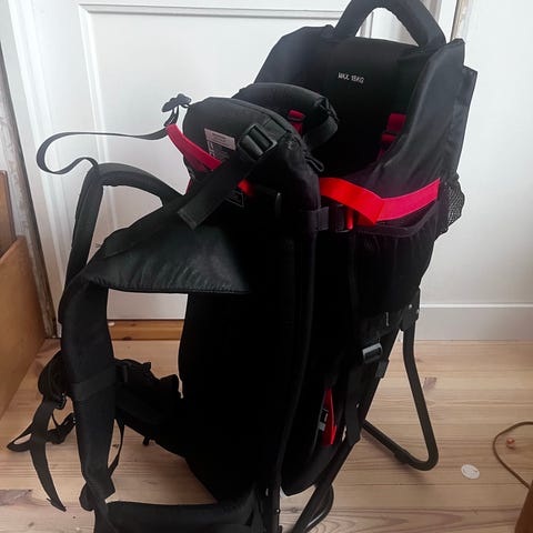 Sparsamt använd bärryggsäck för att bära barn i. Regnskydd samt bytunderlag medföljer. Rymligt ytterfack.