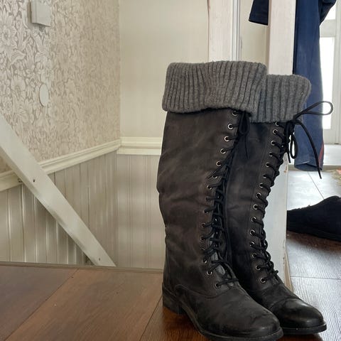 Dessa är kvinnors röda läderstövlar gjorda av Vagabond, med främre snören och eventuellt ett konstgjort pälsfoder för vintersäsongen.