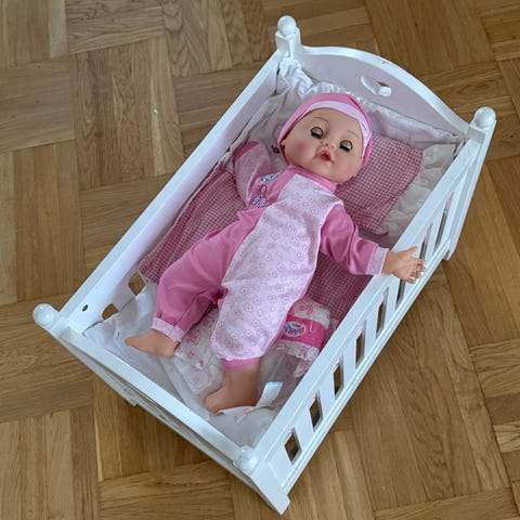 Spjälsäng till dockor tillverkad i trä. Inkluderar en madrass, täcke och kudde. Hämtas i Valbo (Lund).