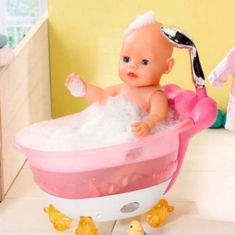 Baby Born barnleksak, rosa badbalja, rosa filt, och olika flaskor. Dockan ingår ej.