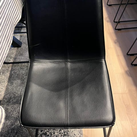 Mio Roberto Pamio matstol i svart läder med träben. Stolen är designad för matsalsbruk och har en hög rygg för stöd. Materialet är läder, vilket ger en slitstark och lättskött yta.