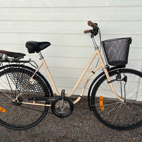 Säljer en stabil och klassisk Skeppshult damcykel i beige. Svensktillverkad kvalitetscykel med påkostade komponenter och tidlös design – perfekt för stad, pendling och vardagsbruk.