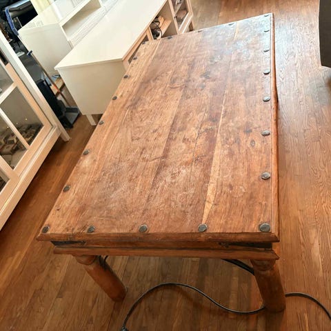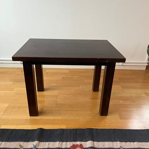 Soffbord i mörkt trä med fina metalldetaljer. Det finns en mindre repa på bordsskivan och några andra kantstötningar, i övrigt fint begagnat skick.
