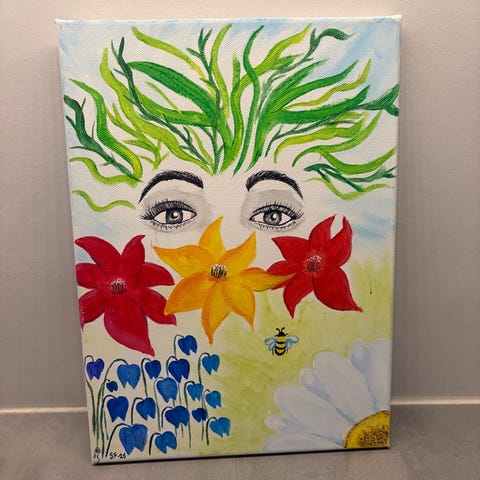 Ny, oljemålning på Canvas med inspirerande färger, motiv Katt med blommor.
