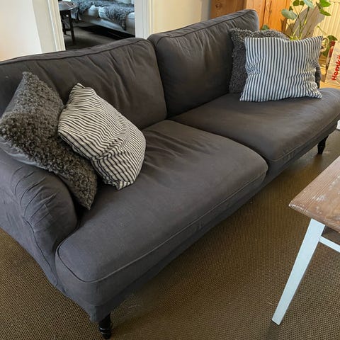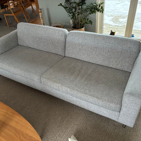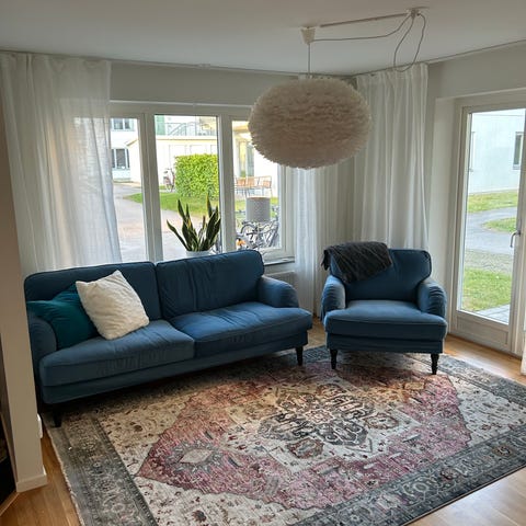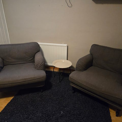 Vi söker antingen en 2-sits soffa (158) cm bred eller 2 stycken fåtöljer Stocksund från IKEA. Viktigt är att klädseln är gråbeige (Nolhaga) och helst svarta ben.