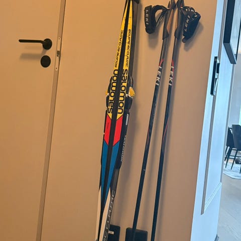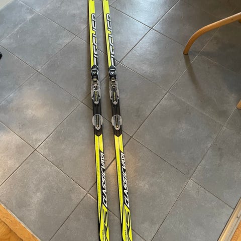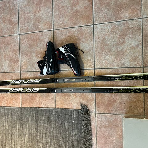 Fischer längdskidor med tillhörande stavar och pjäxor i vitt och svart.