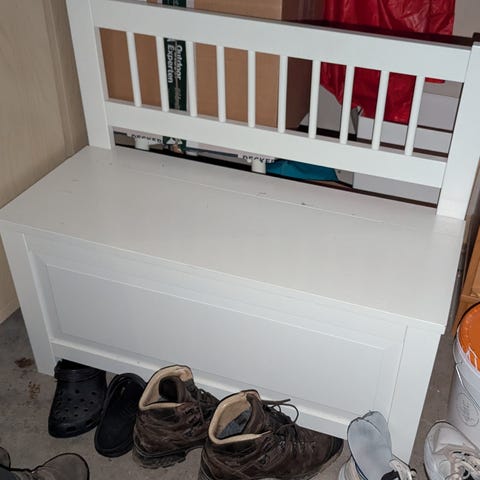 IKEA barnmöbel. Enkel design med två dörrar. Vit färg. Passar för förvaring i barnrum. Klistermärkena kan man ta bort med tvål o vatten. Fullt fungerande