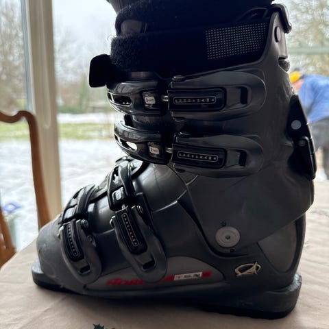 Head skidpjäxor i svart och limegrön färg med spännen för justering. Skidpjäxorna är utformade för att ge stöd och komfort vid skidåkning.