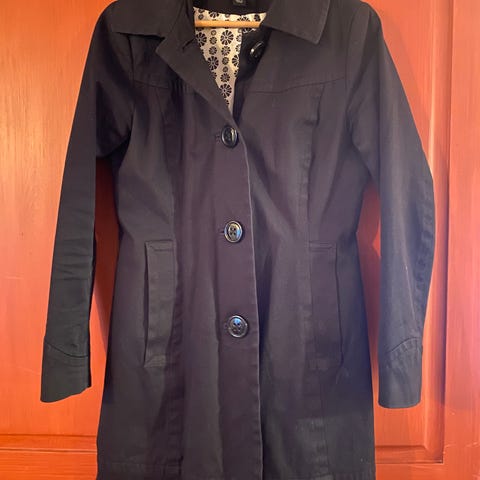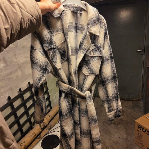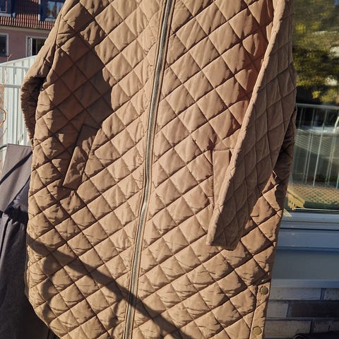 Jackan har en rak passform med knäppning framtill och två framfickor.