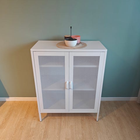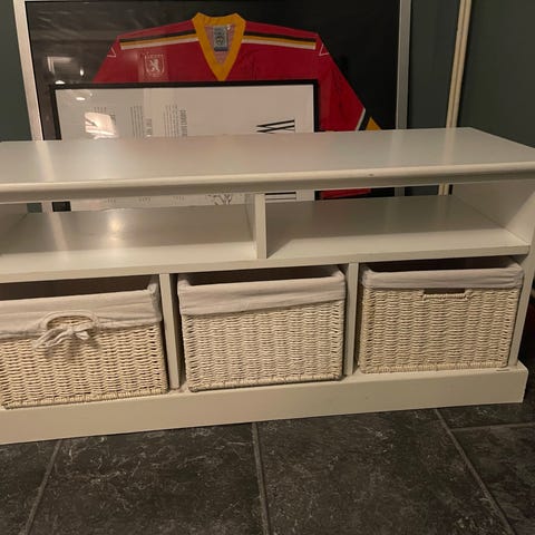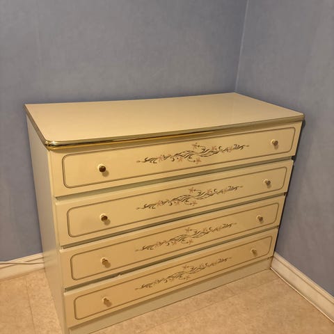 Äldre mindre byrå som är vitmålad och tapetserad på fronterna av lådorna. Utbytta knoppar.