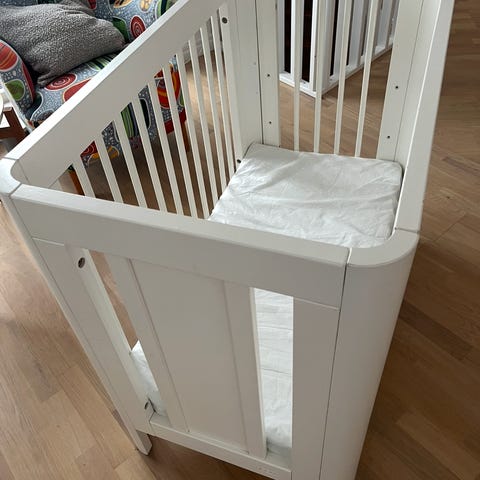 Grå spjälsäng i gott skick med en skada som syns på bilden men som inte påverkar funktionen. Spjälsängen levereras även med en tunn Troll-madrass.