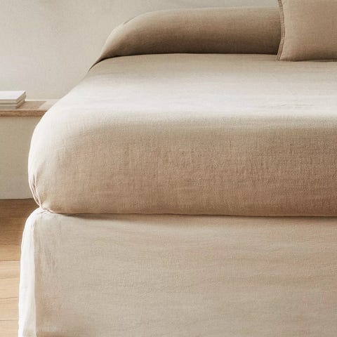 Himla sängkappa beige tillverkad i 55 % linne och 45 % bomull. Passar till 90 x 200 cm säng. 42 cm hög.