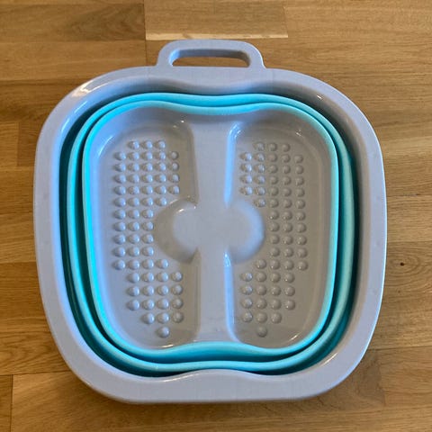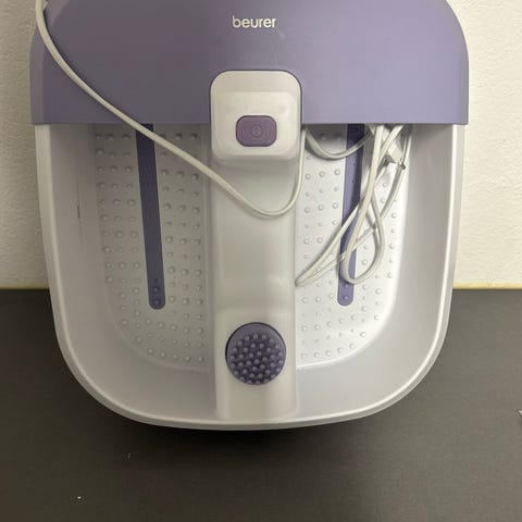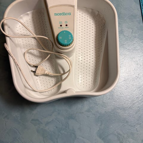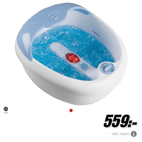 Coline Foot Spa fotbad i vit och blå färg. Utrustad med massagefunktion och temperaturkontroll. Drivs med 230 V och har tre olika inställningar för anpassad användning.