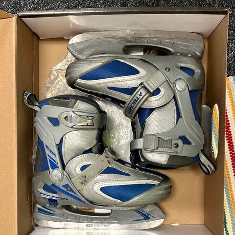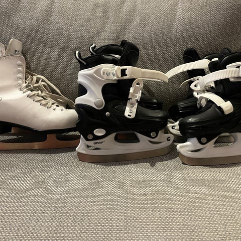 Skridskor i helt ok skick. Praktiska då de kan regleras i storlek 34-37