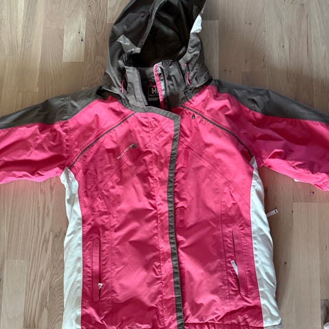 Jackan har röd insida med huva och dragkedja framtill. Byxan har justerbar midja med knappar och dragkedja.