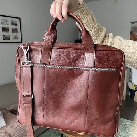 ”Bowlingväska” Weekendbag i läder med handtag och bärrem, sparsamt använd. Mäter ca 40x30cm. Perfekt för jobbet eller helgresan.