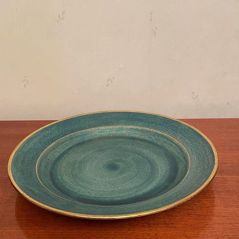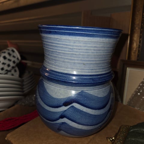 Gustavsberg vas tillverkad i keramik med blå glasyr. Vasens design inkluderar ett mönster av cirklar och en smal öppning upptill. Produkten är avsedd för inredningsändamål.Höjd 33 cm