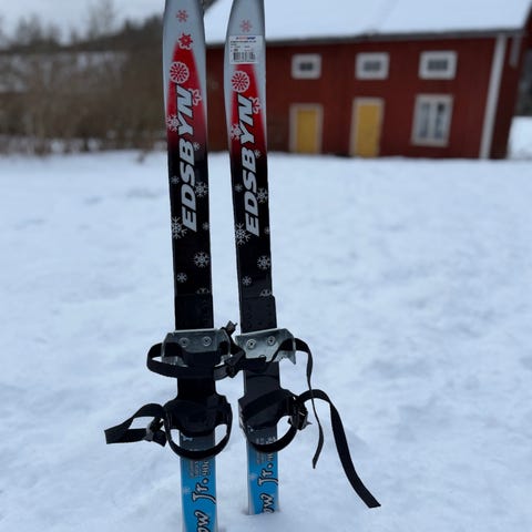 Perfekta första längdskidor för små barn. Bindningarna fästs direkt på vanliga skor (inga pjäxor behövs), vilket gör dem enkla och roliga för de yngsta att börja åka på.