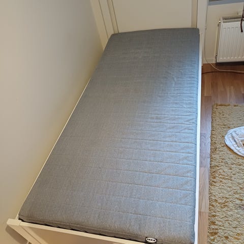 Säng 90 x 200. I fint skick, endast använd under min studietid. Har en mindre fläck (se bild) från transport, annars i fint skick!