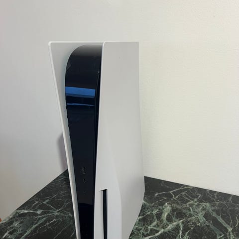 Sony Playstation 5 spelkonsol i vitt och svart. Spelkonsolen är avsedd för användning med Playstations spel och tillbehör.