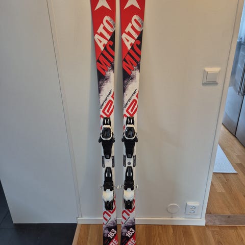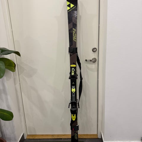 Volkl Racetiger SC skidor med längd 165 cm. Skidorna är designade för alpint bruk och har en svart och gul färgsättning med bindningar monterade.