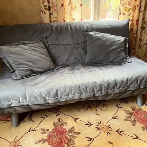Bäddsoffa. Kan fälla ut i tre steg. Kan använda som soffa, säng och schäslong.