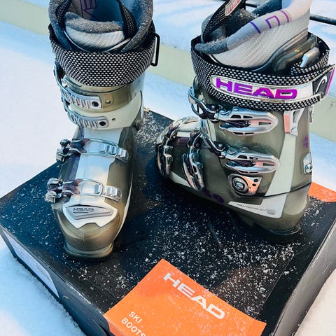 Pjäxorna har fyra spännen och är utformade för skidåkning.