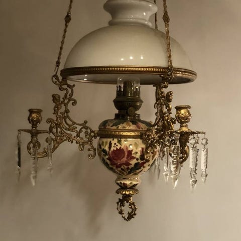 Majolikalampa m inbyggd el, även för fotogen. Nerpackad, så därför har jag ingen bättre bild. Bilden är från 1995. Höj och sänkbar. Mycket stilig. Ser ut som alla andra som annonseras. Finns även extra lampetter Själva majolikan ngt lagad. Hämtas i Sollentuna
