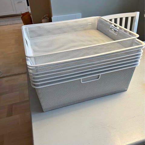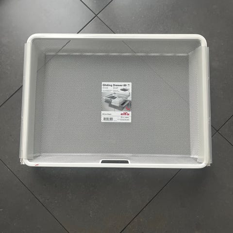 Säljer 2 st utdragbara meshback lådor med skenor från Elfa i serien Decor. 60x43x28cm