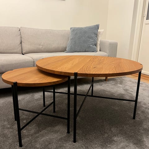 2st soffbord med terazzo stenskiva och svarta stålben. Inköpta på Jakobssons möbler i Örebro. Ett litet hack i lilla skivans yta, men iom mönstret knappt syns.