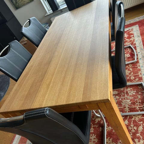 Säljes ett stabilt matbord i massiv ek, perfekt för båda vardag och middag med gäster. Med iläggsskiva (50 cm) får 8 personer plats.
