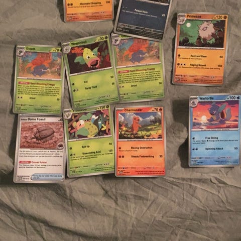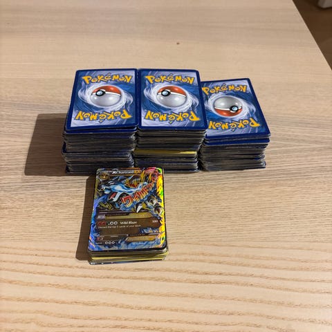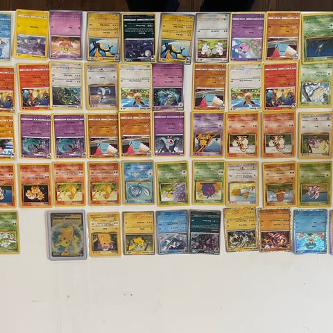 Samling av Pokémon spelkort i olika utföranden och motiv. Kortens skick och specifika utgåvor varierar inom samlingen. Sammanlagt cirka 450 pokemonkort från olika kortserier och årtal
