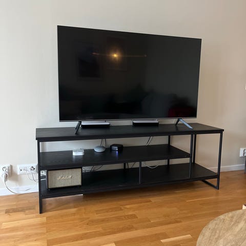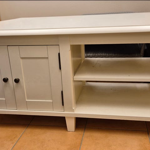Tv bänk Mio med förvar. Tv bänken original knappar är i silver (se bild 2). Tv bänken är använd men i gott skick, säljes för 650 kr. Priset kan diskuteras vid snabb affär.