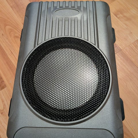 MDS subwoofer i sluten låda med svart filtklädsel. Lådan är utformad för att förstärka basljudet i ljudsystem. 10 tum