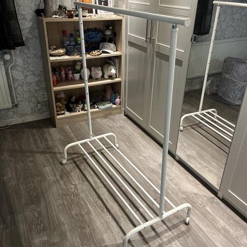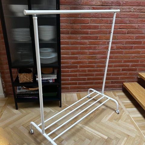 IKEA Klädstång klädställning RIGGA i svart färg. Just färgen har utgått. Består av metall med en enkel design för upphängning av kläder. Passar för användning i hem eller andra utrymmen där extra klädförvaring behövs. Går att ställa in höjd i flera lägen. På hjul så även smidig att förflytta. Jättefint skick!