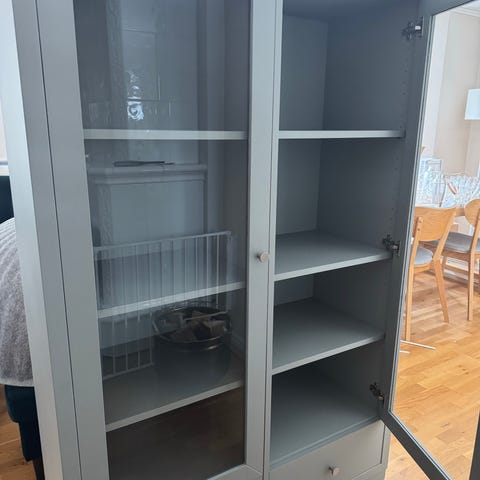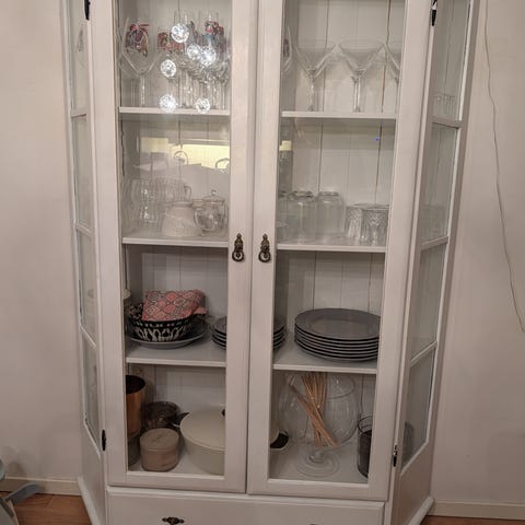 Stort och stabilt omgjort furu vitrinskåp med glasdörrar fint – perfekt för porslin, glas eller prydnadssaker.