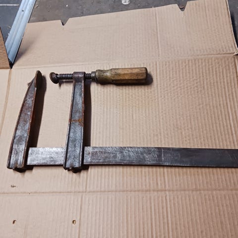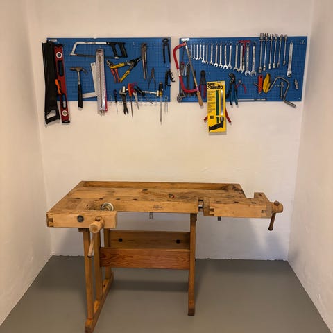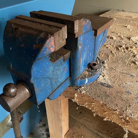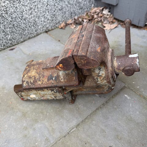 Gammalt skruvstycke / smidesskruvstycke. Bastant och rejält. För förskrivning i bänk/bordsskiva.