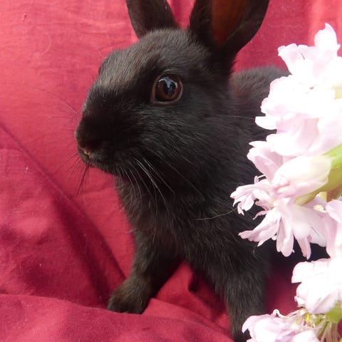 En svart/vit hona, hermelin med härstamningsbevis. Också 1år gammal. Fått två friska kullar.