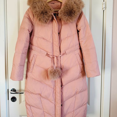 Moncler vinterjacka i storlek S för dam. Jackan är brun och tillverkad av dun, vilket ger god isolering och värme. Den har en bälte i midjan för justerbar passform och en huva med avtagbar pälsdetalj. Passar för kalla vinterdagar.