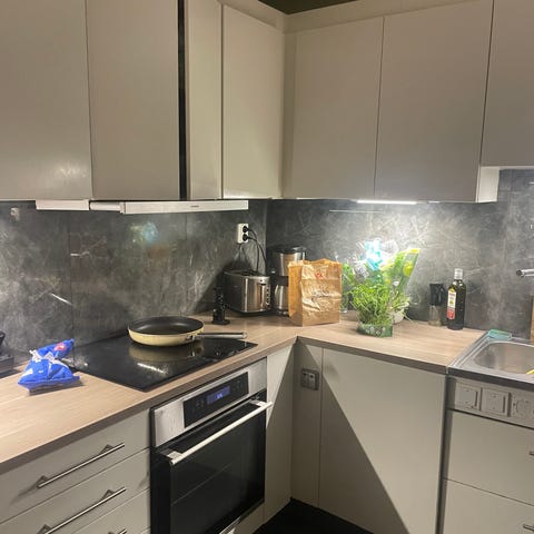 Spisplatta (ej induktion) ingår, ugn (nästan aldrig använd) kan köpas till för 1000 kronor. Kyl och frys ingår inte.