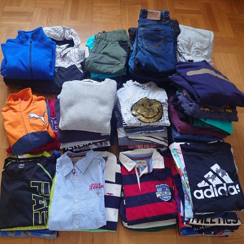 Det finns skjortor, jacka (vår), regnjacka, badbyxor, pyjamas, t-shirt, pikétröjor, långärmade t-shirts, tjocktröjor, shorts, träningskläder (löparbyxor m.m.), mjukisbyxor och jeans.