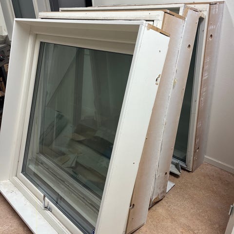 Växthusbygge i vår? Höga fönster utan karm i fint skick. Översta raden 4 par (bild till vänster) plus 14 enkla utan ovanfönster ( 123 x 53,5 cm). Ett med trasig ruta.