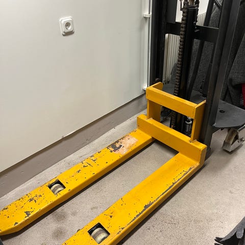 Qleeno Palllyft i blå färg. Utrustad med gafflar för att lyfta och transportera pallar. Lämplig för industriellt bruk och lagerhantering.