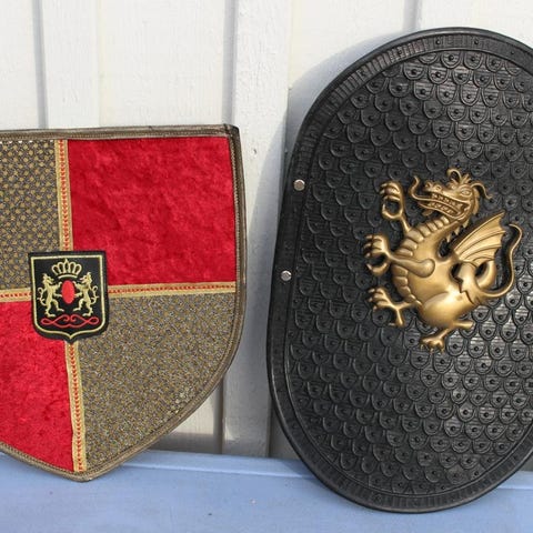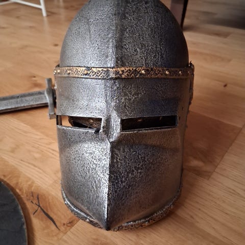 Riddarrustning med sköld, hjälm och hillebard. Köpt i souvenirbutiken på Borgholms slott för ett par år sen. Passar både barn och vuxna.