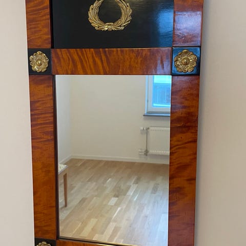Den största spegeln är 40x30 cm med mörkbrun träram.