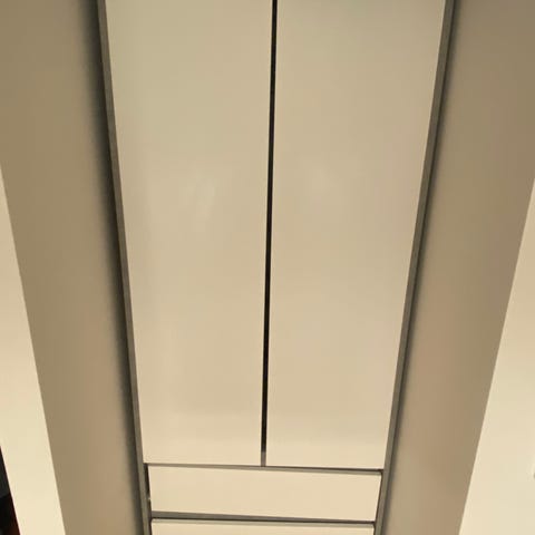 IKEA garderob, vit. Garderoben har två dörrar, en klädstång och hyllplan för förvaring av kläder och andra föremål.