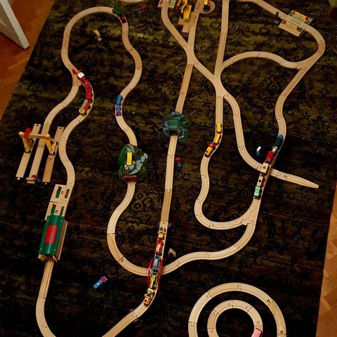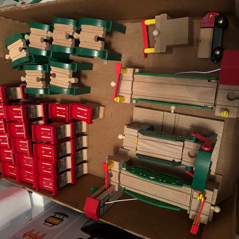Totalt 165 delar. Setet innehåller kurvor, raka rälsdelar m.m. samt broar, tåg och olika tillbehör för att bygga och leka med träjärnväg.