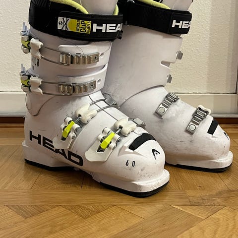 Salomon X Max LC 80 skidpjäxor i storlek 23.5, färgerna vit och gul. Skidpjäxorna har flera spännen för justerbar passform och är utformade för att ge stöd och komfort vid skidåkning.