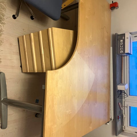 Vitt skrivbord 127x63 cm med maxhöjd 74 cm då aluminiumbenen är höj- och sänkbara och den vilar på hurtsen. .